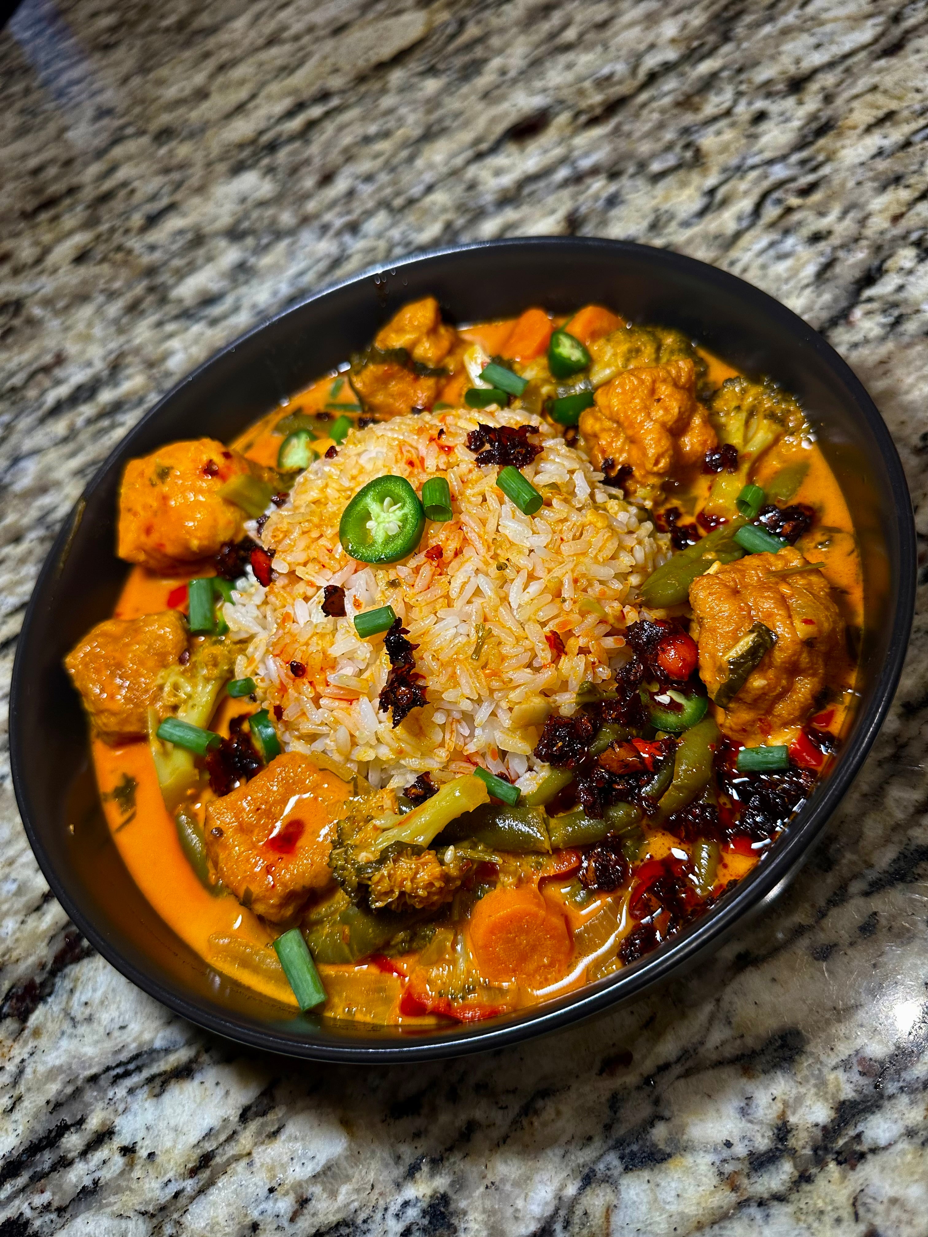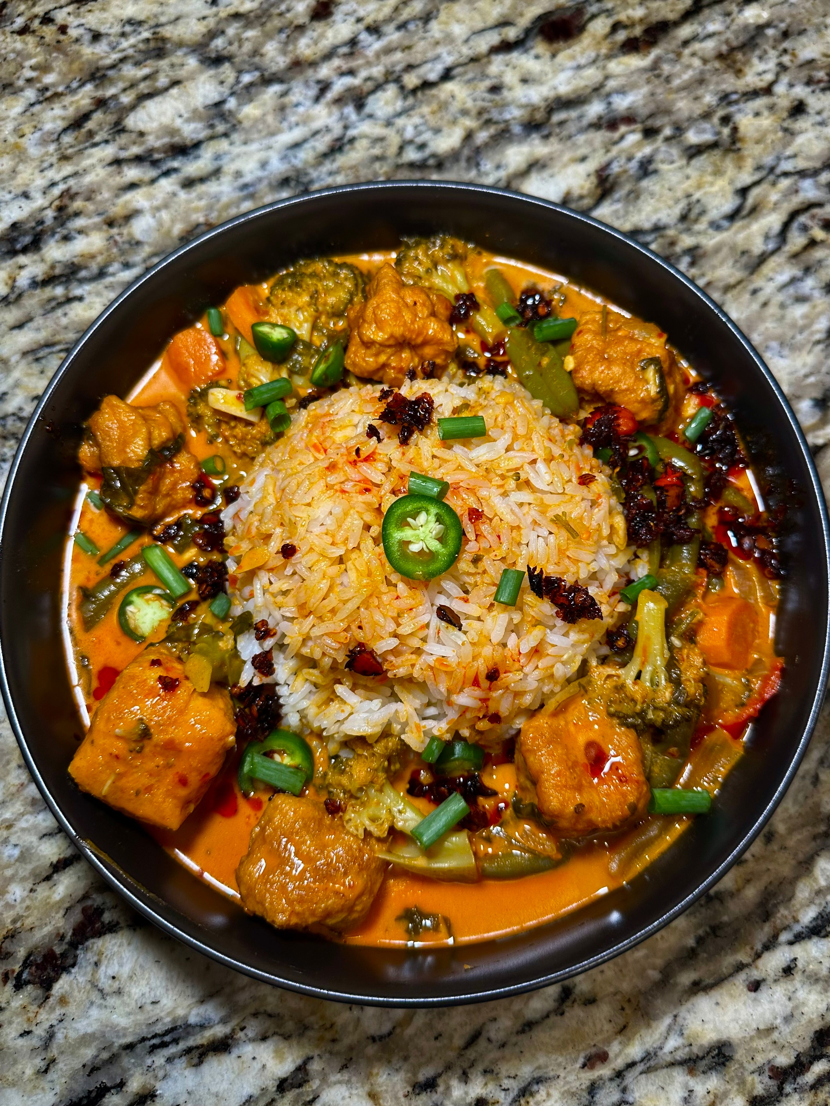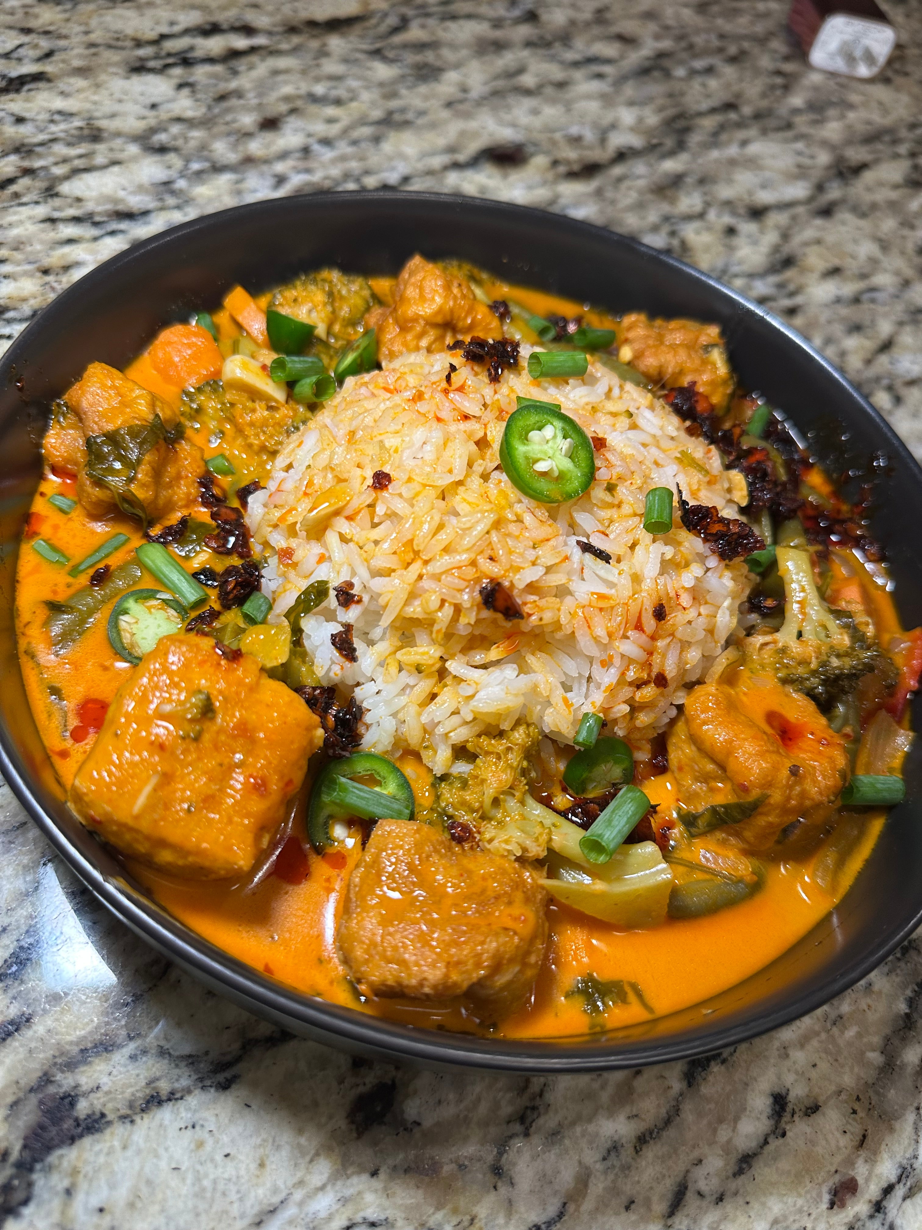 This Thai Red Curry with Tofu is creamy, spicy, and full of flavor, the perfect comfort meal. It’s made with coconut milk, red curry paste, fresh veggies, and crispy tofu that soaks up every bit of the sauce. Serve it over rice and top with a little chili oil for a cozy, restaurant-style dinner you can make right at home.